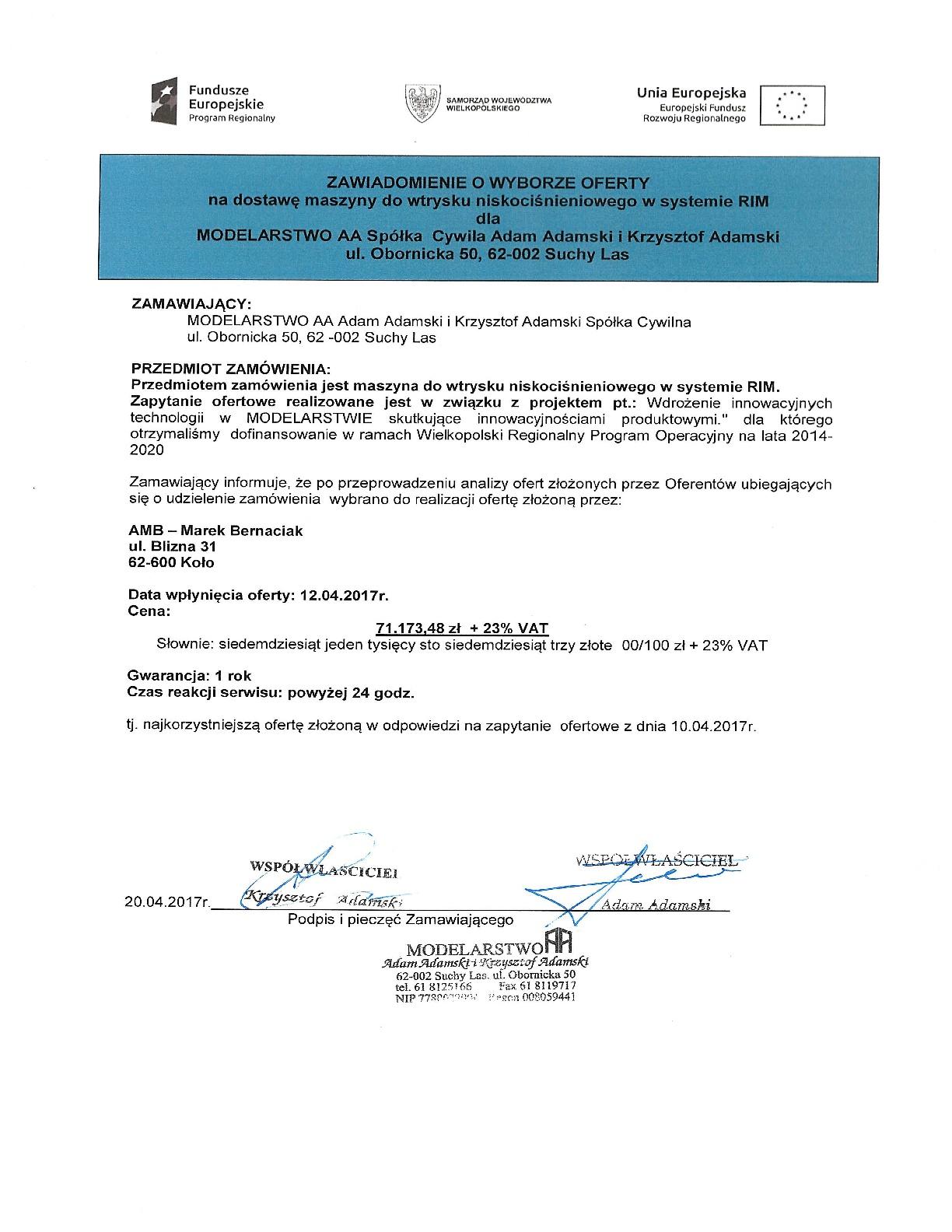 - Zawiadomienie o wyborze oferty na dostawę maszyny do wtrysku niskociśnieniowego w systemie RIM (pobierz)